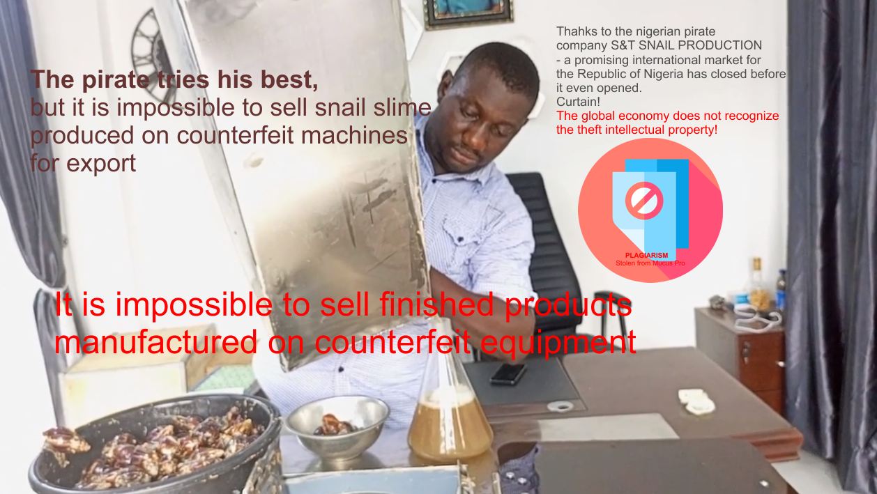 By violating international copyright and patents that protect the equipment of a world manufacturer, the Nigerian company S&T SNAIL PRODUCTION has come to the attention not only of the law enforcement agencies of the Republic of Nigeria and the embassies of many countries, but also of Interpol and the WTO. The owner of the trade mark “Mucus pro” and the developer of the equipment, the company Bila M, has already conducted an expert assessment of the damages from plagiarism caused by the side of S&T SNAIL PRODUCTION as of January 2023, the damage assessed at more than 100,000 US dollars, not including compensation for damage caused to intellectual property and the amount of losses will only increase, the amount of fines and compensation may exceed half a million dollars. The criminal proceedings against S&T SNAIL PRODUCTION also include the name of a citizen of Nigeria, Theocracy Edafe, who will soon be subject to international economic sanctions.